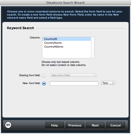 Specify the form element used to pass the text parameter necessary to make the comparison. If you are using an existing search form (specified in Step 1 of the wizard, Search page selection), you have the option of either adding a new form element or using an existing form element. If creating a new form, specify a unique name for the form field to identify and label it. Upon completing the wizard, you may use Dreamweaver to customize the search page specific to your needs.Existing form field: If using an existing search page and form, select if you wish to use an existing form element to make the comparison. All form elements contained in the form specified in step 2 of the wizard are available in the list.