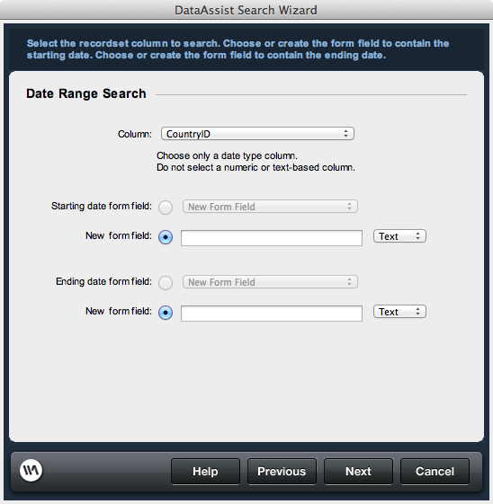 Specify the two form element used to pass the maximum and minimum date parameters used to make the comparison. If you are using an existing search form (specified in Step 1 of the wizard, Search page selection), you have the option of either adding new form elements or using existing form elements. If creating a new form, specify a unique name for each form field to identify and label it. Upon completing the wizard, you may use Dreamweaver to customize the search page specific to your needs.Starting date form field: Specify the form element used to pass the minimum date used for the comparison.