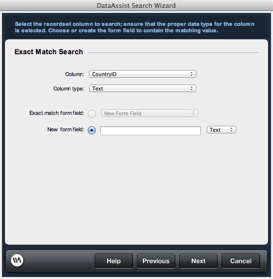 Specify the form element used to pass the parameter necessary to make the comparison. If you are using an existing search form (specified in Step 1 of the wizard, Search page selection), you have the option of either adding a new form element or using an existing form element. If creating a new form, specify a unique name for the form field to identify and label it. Upon completing the wizard, you may use Dreamweaver to customize the search page specific to your needs.Exact match form field: If using an existing search page and form, select if you wish to use an existing form element to make the comparison. All form elements contained in the form specified in step 2 of the wizard are available in the list.