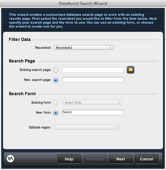 - If an existing form is referenced, a hidden form element is added to the form to correlate it to the particular DataAssist Search server behavior application on the current page.