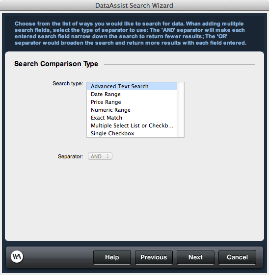 Note: The comparisons configured using this wizard are designed for standard implementations. Advanced search configurations can be achieved by either editing the application of the DataAssist Search server behavior applied to your results page by this wizard, or by applying this server behavior directly to your results page.